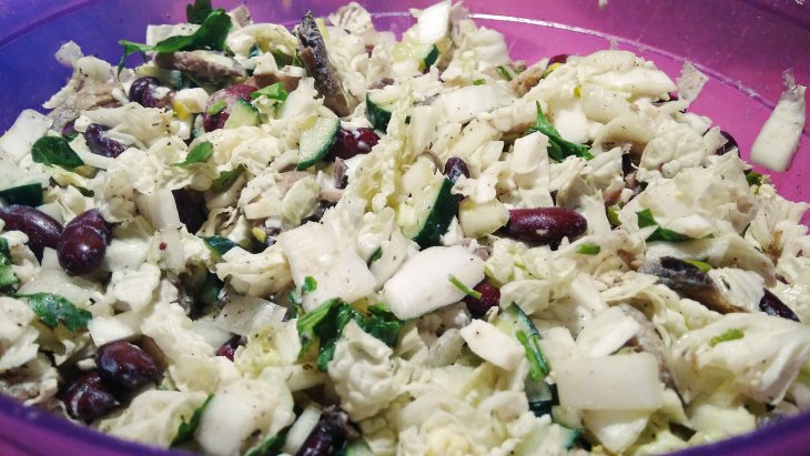 | Салат с пекинской капустой, шампиньонами, фасолью и яйцом на оливковом масле |