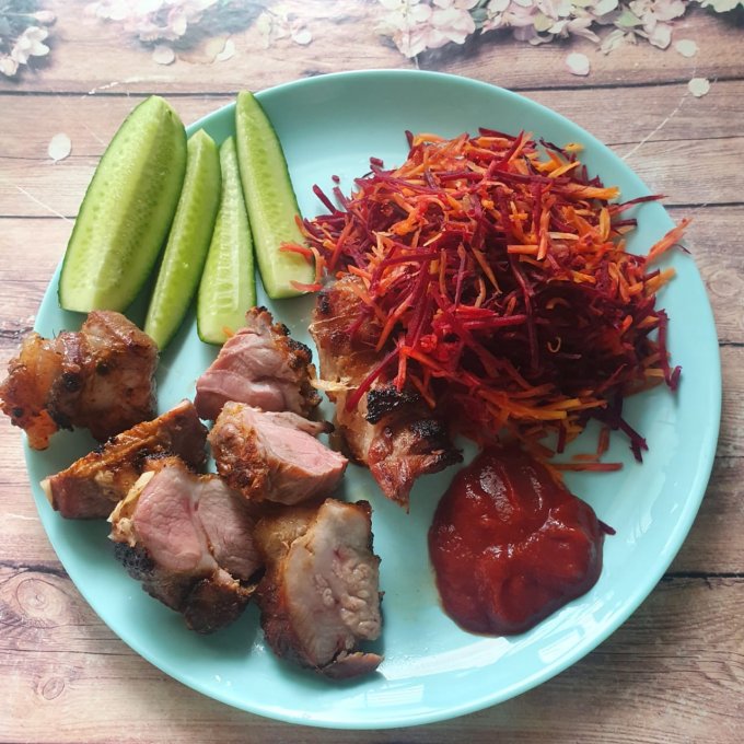 | Свинина, стейк из окорока, без костей, мясо с жиром, жареная на огне |