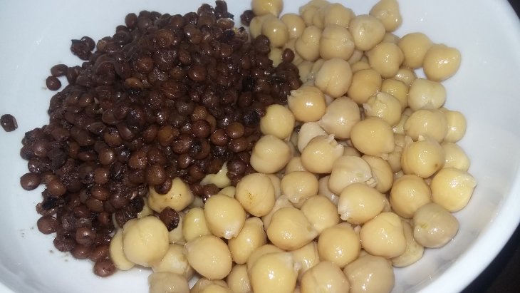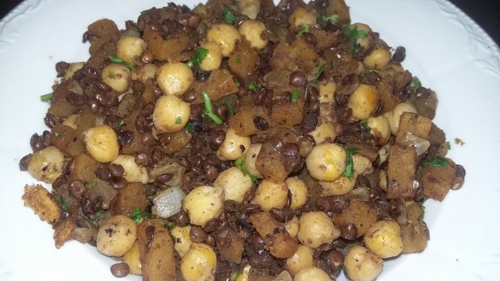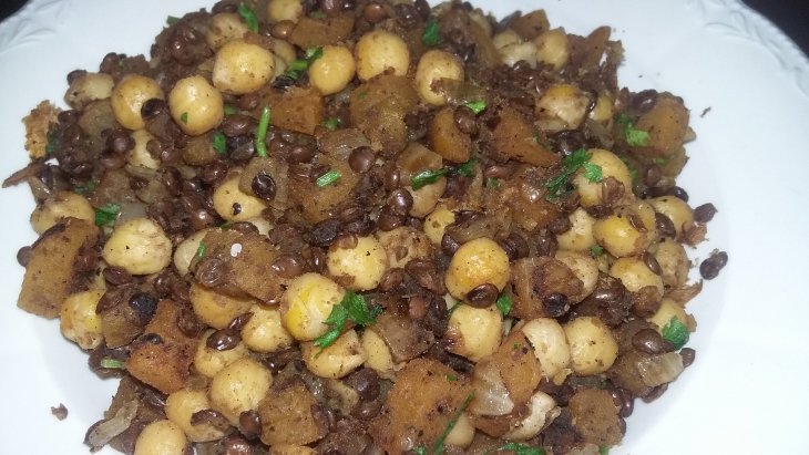 Налила в сковороду немного кукурузного масла, обжарила лук и батат (до мягкости), добавила нут с чечевичей и специи, немножечко воды, прогрела несколько минут все вместе. Перед подачей смешала с петрушкой. Дальше можно есть так или заправить растительным маслом. Я бы предпочла льняное (но это не всем нравится) или оливковое.