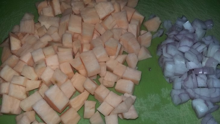 Лук и батат (при желании можно заменить тыквой) порезала мелкими кубиками.