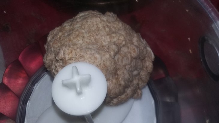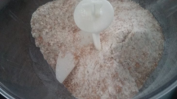 Насыпала цельнозерновую муку в чашу блендера для замеса теста. Это, конечно, можно делать и ручками, и с помощью миксера (насадки для теста).