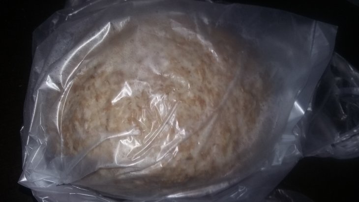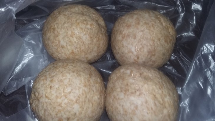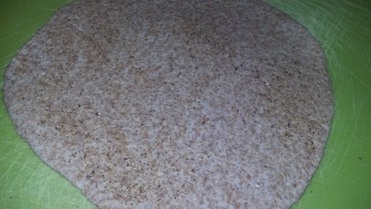 Дальше каждый шарик раскатала в лепешку. Первая лепешка раскаталась без проблем, а вторая начала приставать немного к скалке. Тогда, вместо муки, я решила раскатывать их на отрубях.