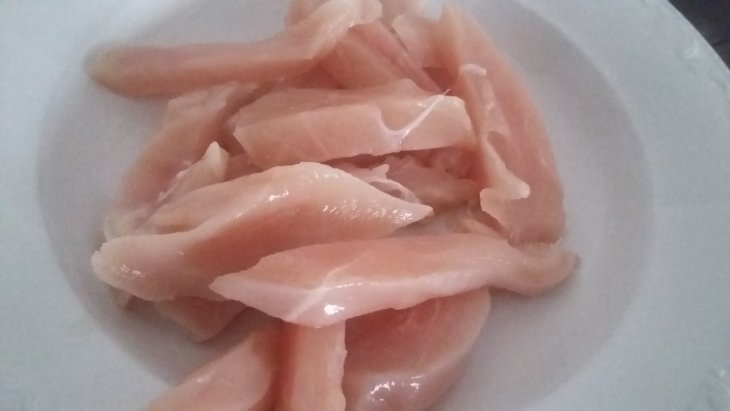 Куриную грудку нарезала кусочками в виде широких полосок.