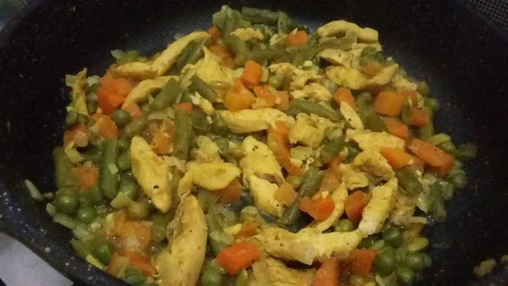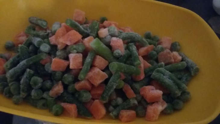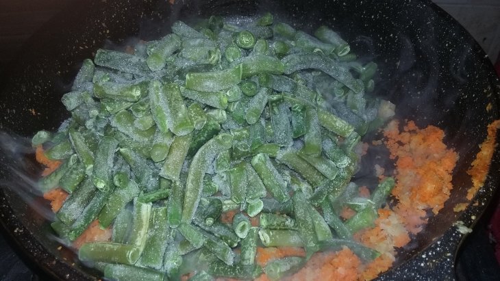 В морозилке у меня была смесь из моркови, спаржевой фасоли и зеленого горошка. Вот пол пакета себе к обеду и отсыпала.