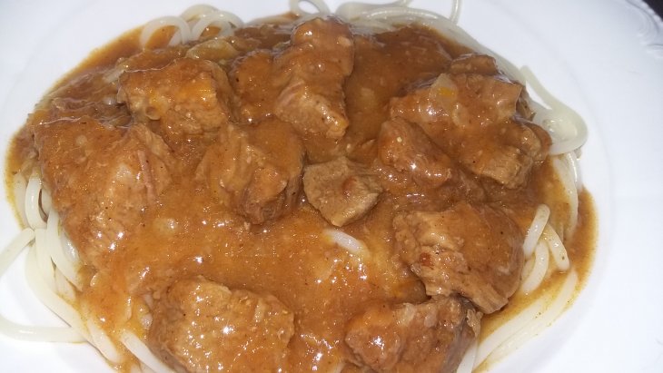 Обжаренную с луком муку добавила к мясу. Проварила несколько минут до легкого загустения подливки и посолила. Благодаря подливке такое блюдо подходит практически к любому гарниру (рис, паста, картофель...)