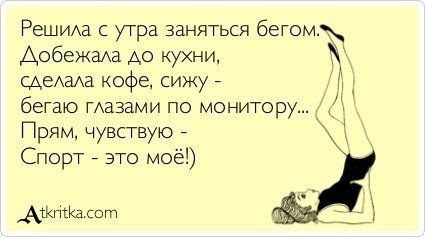 Пора потихоньку входить в колею тренировок и прочей физ. активности после перерыва. То остановиться не могла, то теперь снова начать сложно. Выбивают меня ЭТИ дни из равновесия довольно существенно. :cry:Каждый раз как заново начинаю приучать себя к движению на бОльшие расстояния, чем диван-комп-кухня. Завтра придется дать самой себе хорошего "ПНЯ" для ускорения тела и вернуть все на круги своя. :кулак:
