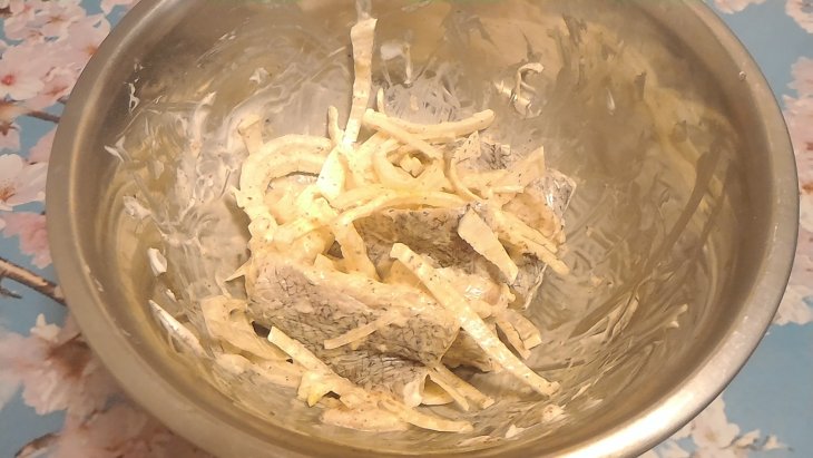Для тех, кто не любит лук, могу предложить попробовать вместо него сверху на рыбку положить не толстую дольку лимона.