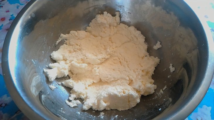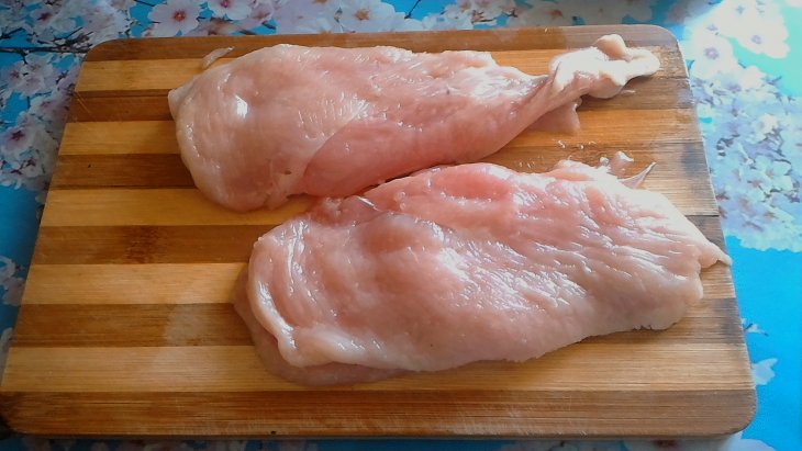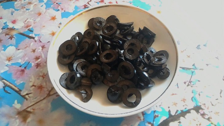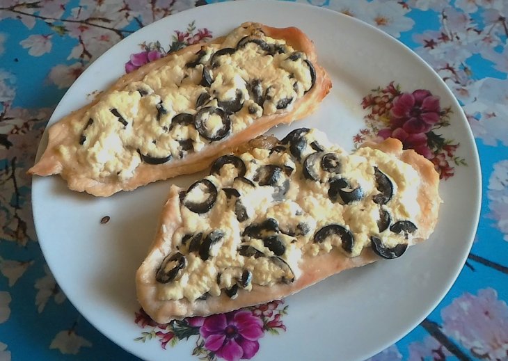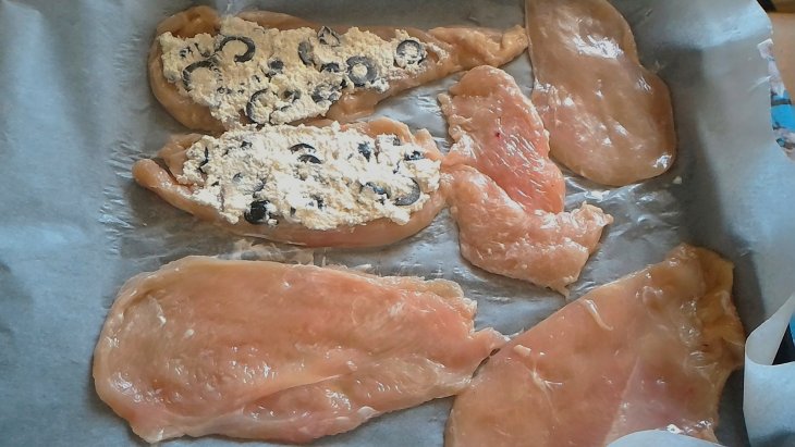 На курицу не толстым слоем выкладываем и разравниваем творожную массу, смешанную с колечками маслин (и не помешали бы АНАНАСЫ, но у меня их не было, т. к. мысль приготовить это блюдо мне в голову пришла спонтанно).