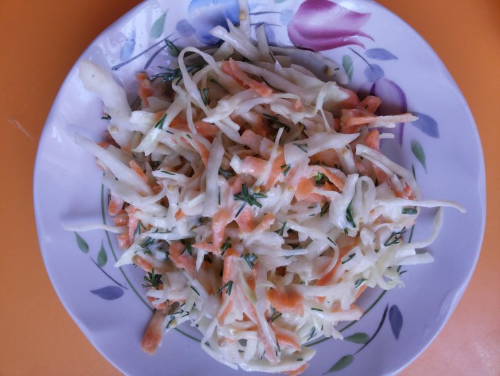 Нашинкуйте капусту, порежьте лук, натрите морковь. Взбейте йогурт, горчицу воду, лимонный сок. Добавьте овощи и перемешайте.