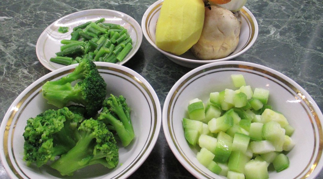 Подготовьте продукты по рецепту. Нарежьте в произвольной форме.