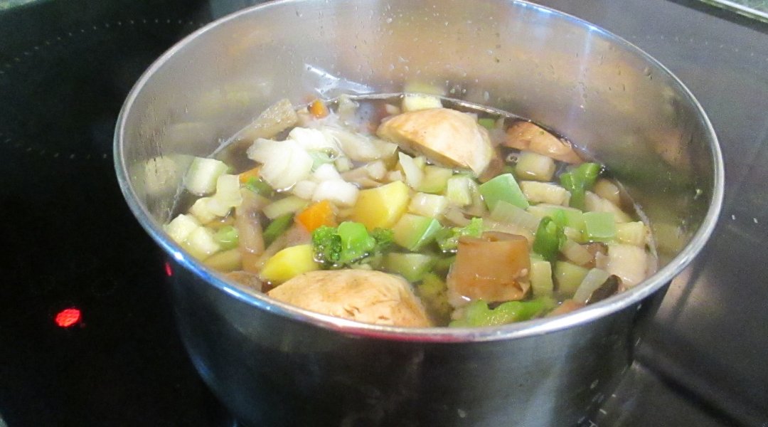 Вскипятите воду и отправьте вариться все овощи вместе с грибами.