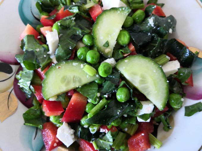 Второй день стараюсь соблюдать правильное питание. В магазине недорого купила свежий шпинат. Придумала салатик из того, что было в холодильнике подходящего: шпинат, сладкий красный перец, огурец свежий, зел. горошек замороженный, брынза, оливковое масло. Получилось вкусно. Завтра попробую добавить ещё чуть бальзамического уксуса.