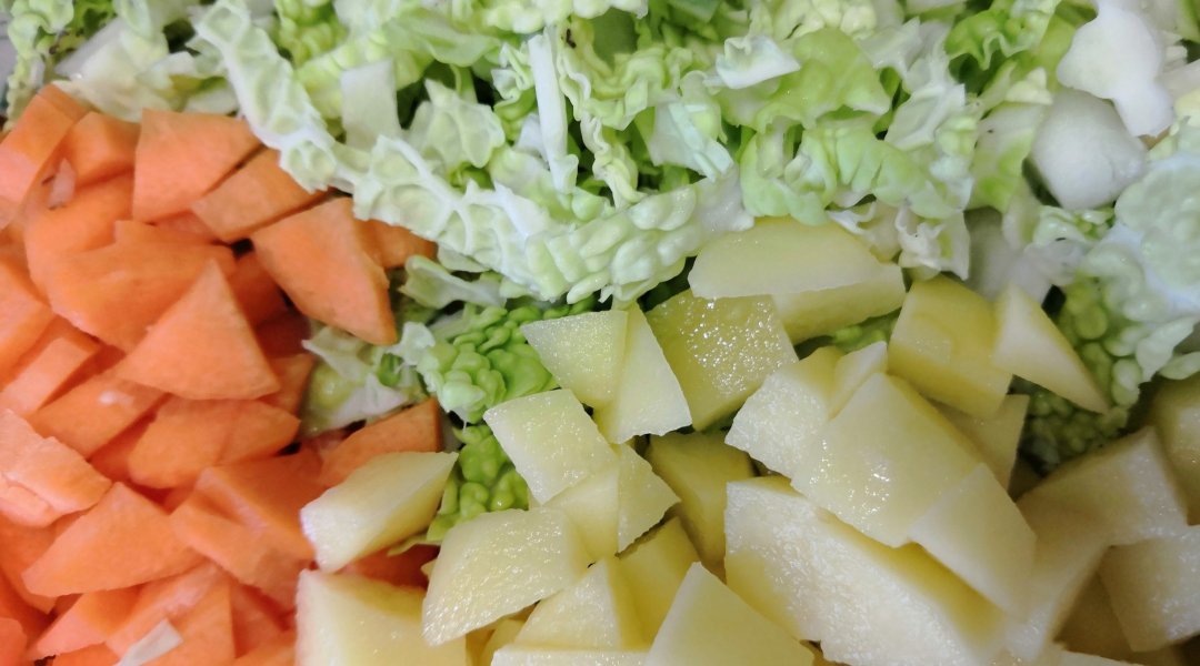 Порезать мелкими кубиками филе курицы, морковь, савойскую капусту и