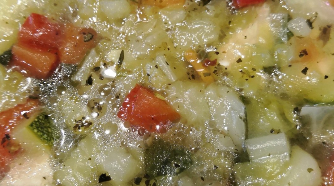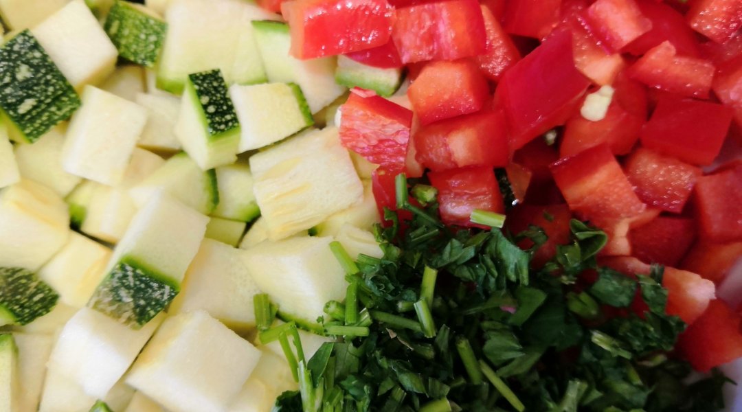 Пока варится порезать мелкими кубиками кабачок и красный перец, по