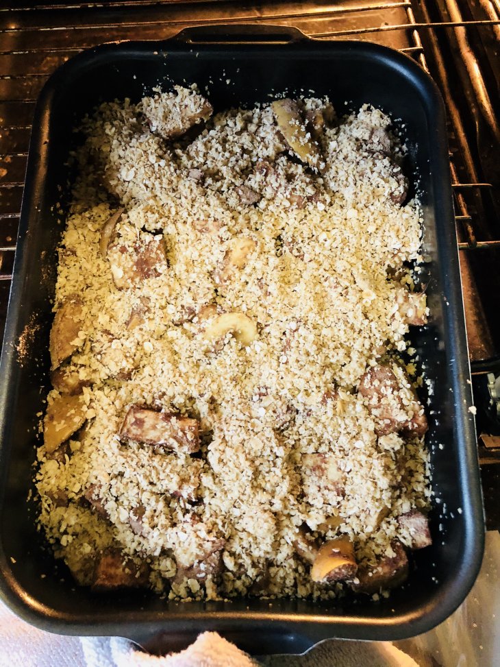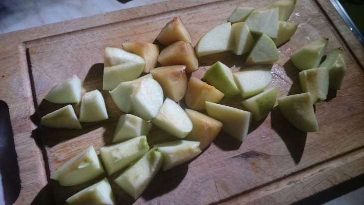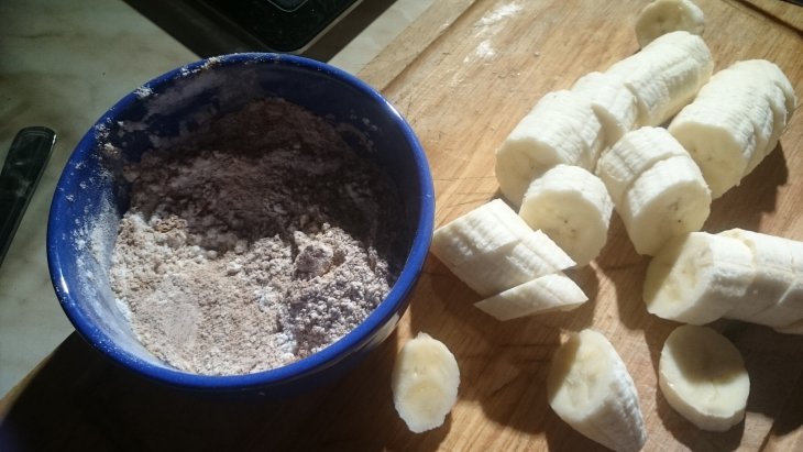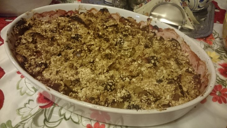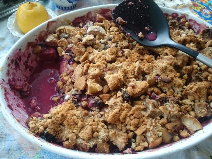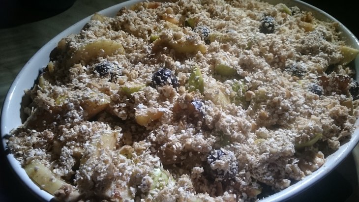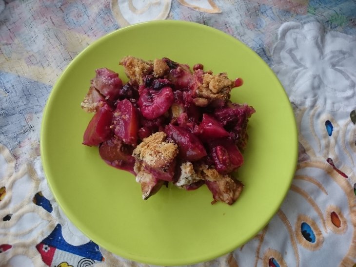 Если я ем этот пирог на завтрак, то добавляю к нему вот такую смесь: нежирный мягкий творог 50-60г, 1-1,5% питьевой йогурт 20-25г и 5-7г меда. Смесь тщательно растираю. Получается что-то типа мусса. Для сладкого завтрака рейтинг и калорийность более чем приличные.