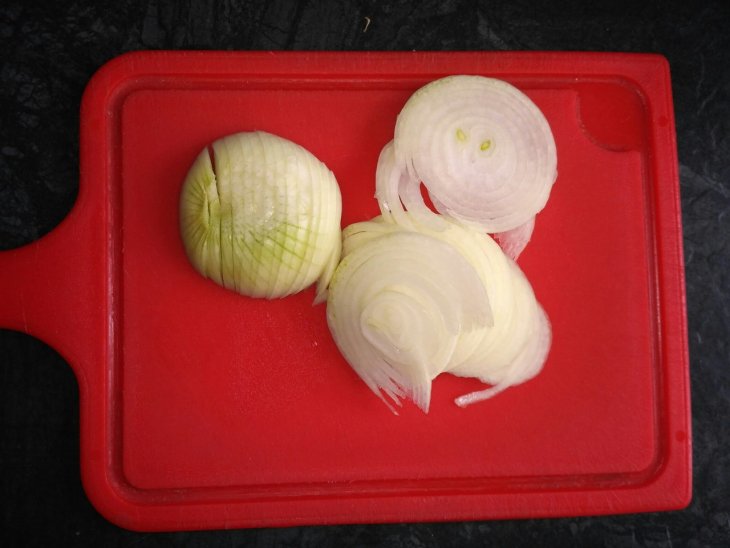 Порежьте лук кольцами и добавьте его к печени, продолжая обжаривать