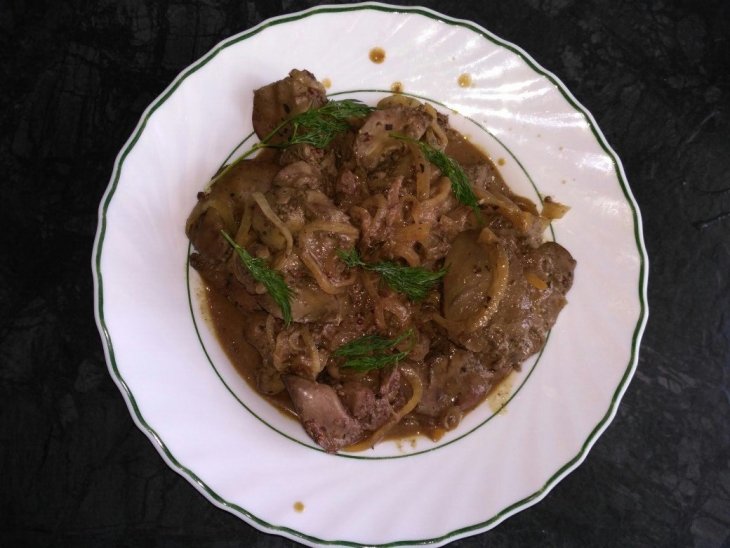 Готовым соусом заправьте куриную печень. Оставьте все томиться