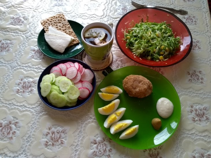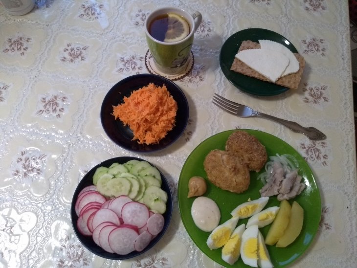 Ужин собрала, сфоткала и поняла, что весь не съем. Убрала маленькую котлету, хлебец, кусочек картофеля, кусочек сыра. В дневнике цифры исправила.