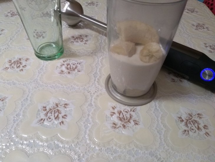 Холодный творог, йогурт, банан положить в стакан для блендера и тщательно взбить.