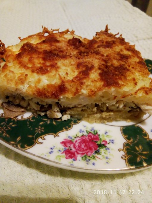 слой курицы с грибами и закрываем вторым слоем картофеля. Смазываем