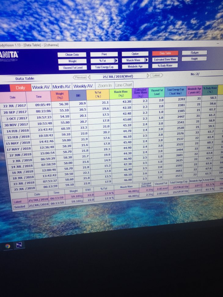 Сейчас взвесилась на своих танита ) у меня 44 кг мышц при весе 59,2