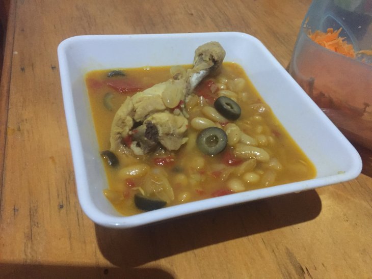 протушить, добавила томаты, чеснок, оливки и куриные окорочка. Из