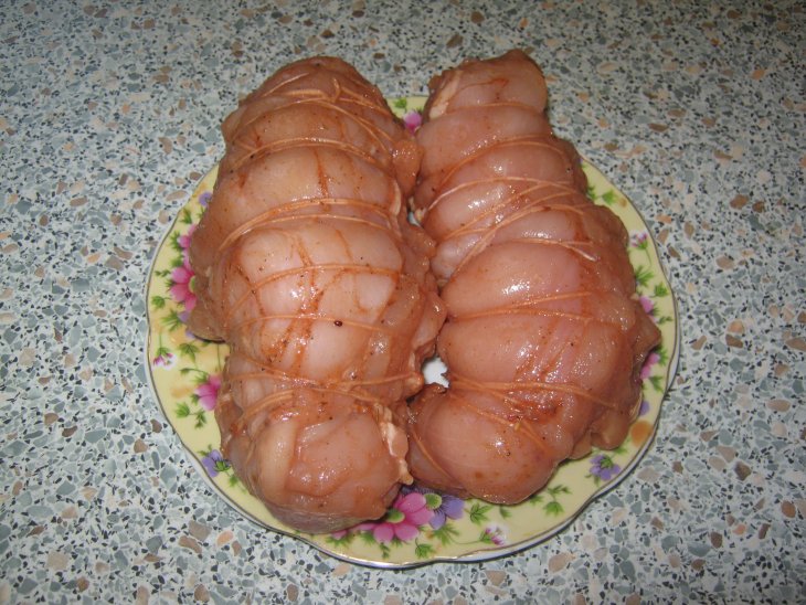 сторонами. Толстой нитью туго стягиваем филе в виде колбаски. На