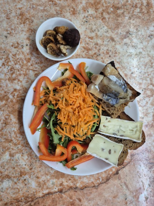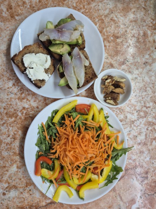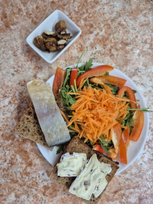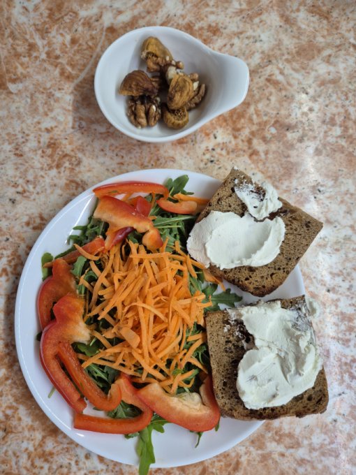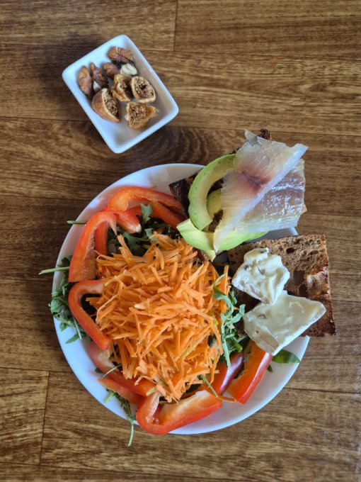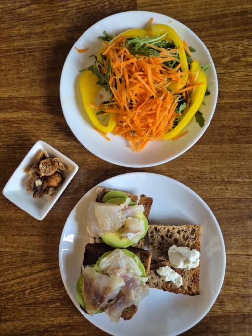 На завтрак бутерброды с провесной дорадой, немного сыра, руккола, морковка, перец, инжир с орехом.