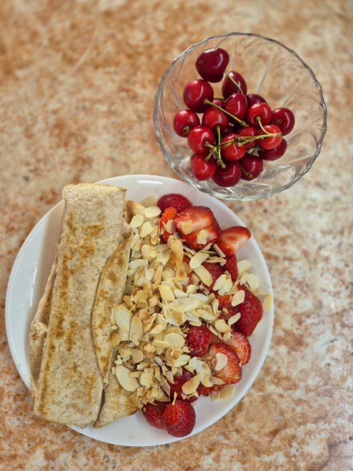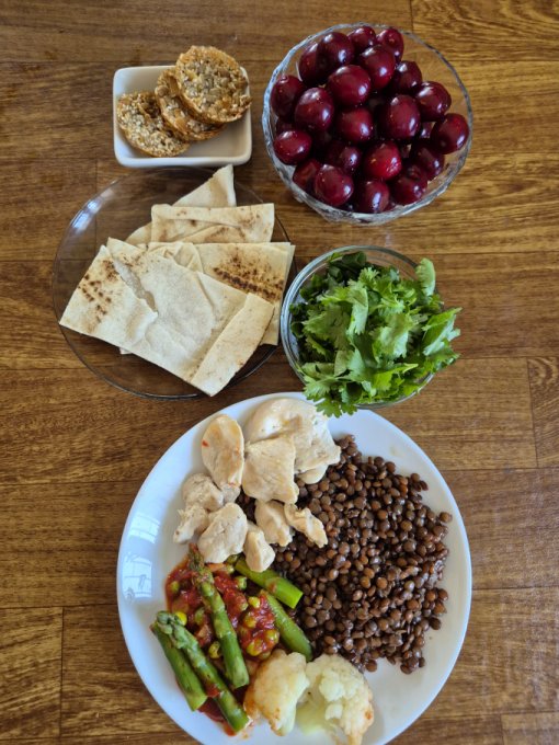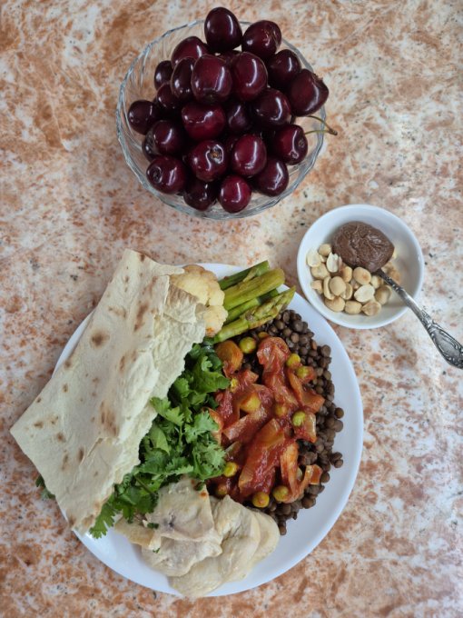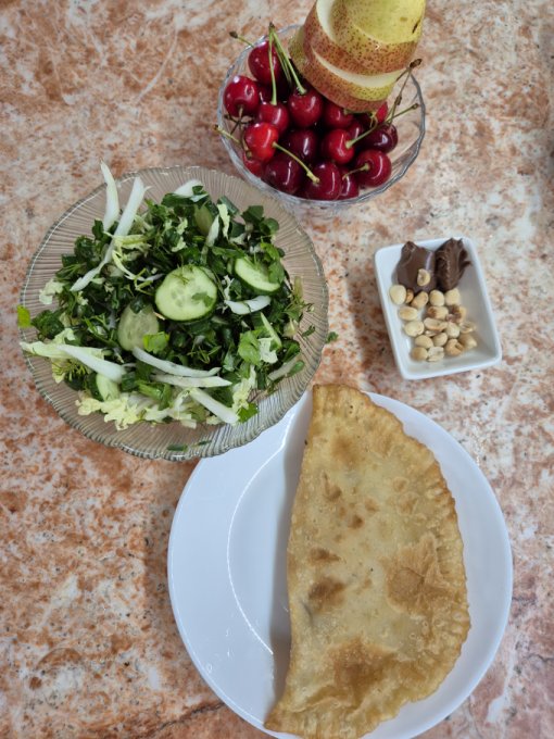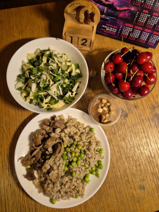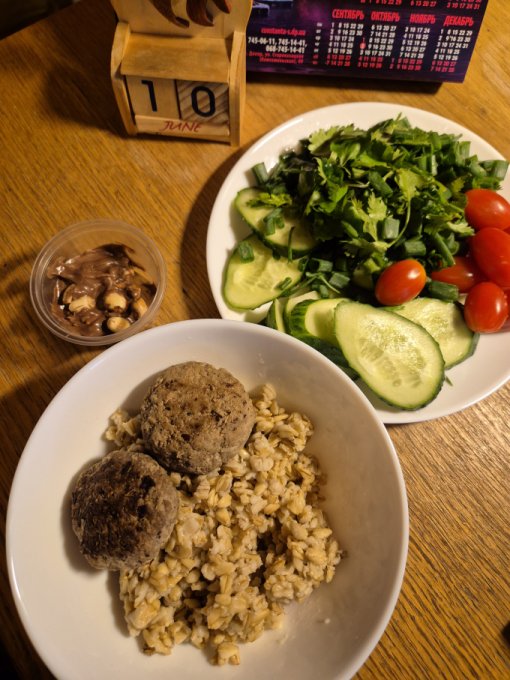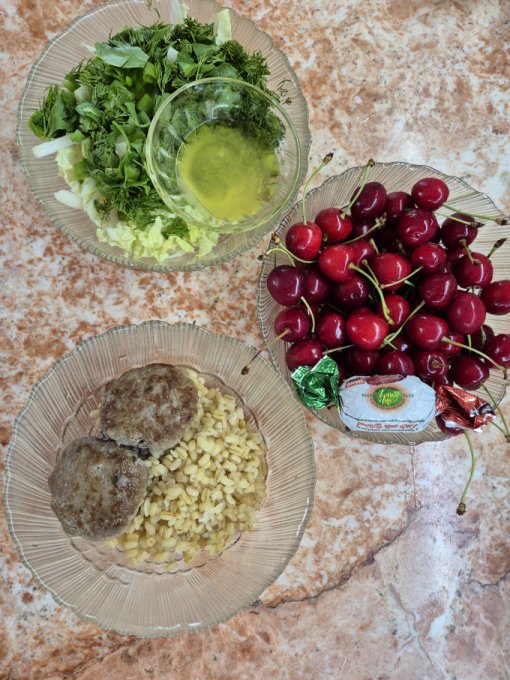 Обедала позже обычного- котлеты из телятины с булгуром, салат, черешня и конфета.