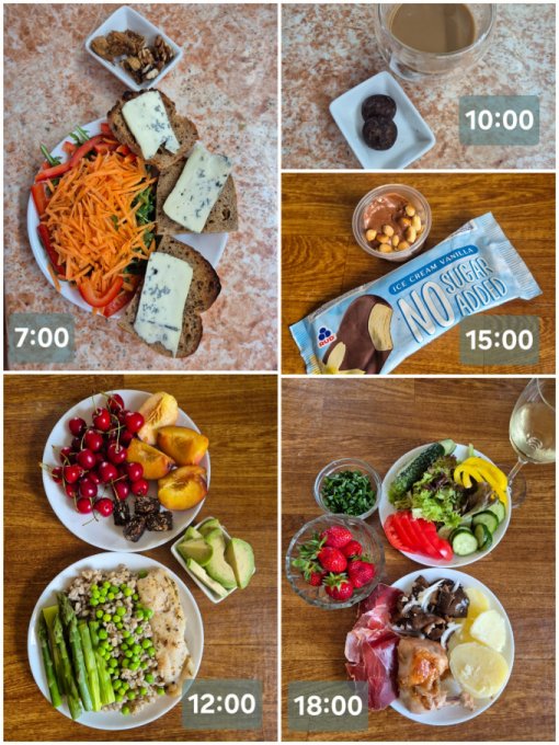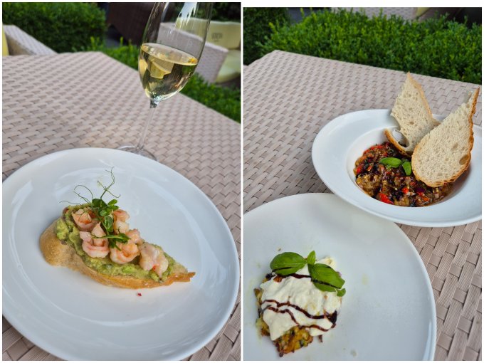 Ужинали поздно, по моим меркам, в 19:30. Съела брускетту с авокадо и креветками. Заказала себе икру из баклажанов, дочка подкинула кабачковый оладушек со страчителлой. Бокал просекко. Вроде всё диетическое, а насчитала аж 800 ккал. И жиров явный перебор за день.