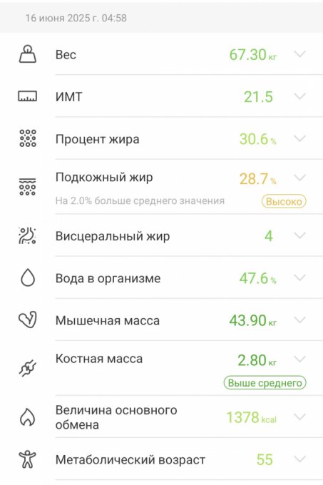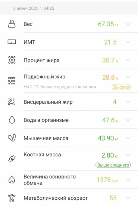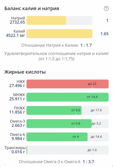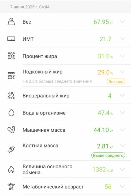 Так что дефицит небольшой, всего 357 ккал, вес на удивление на месте - 67,95 кг, потому что поздно ужинала, по соли как обычно, перебор.