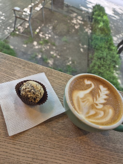 До обеда капучино с конфетой из финика с ореховой пастой.