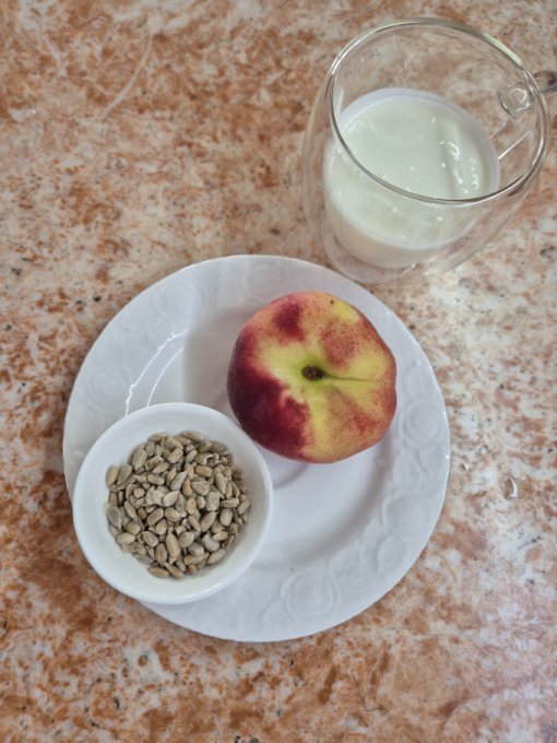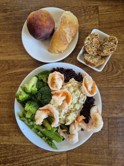 Обедала креветками с рисом, брокколи, спаржа, лук порей в сливках. Кусочек хлеба. Персик и козинаки.