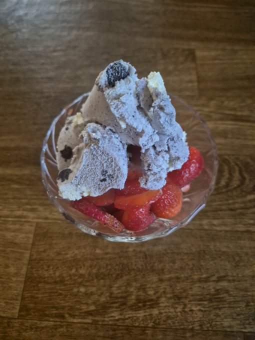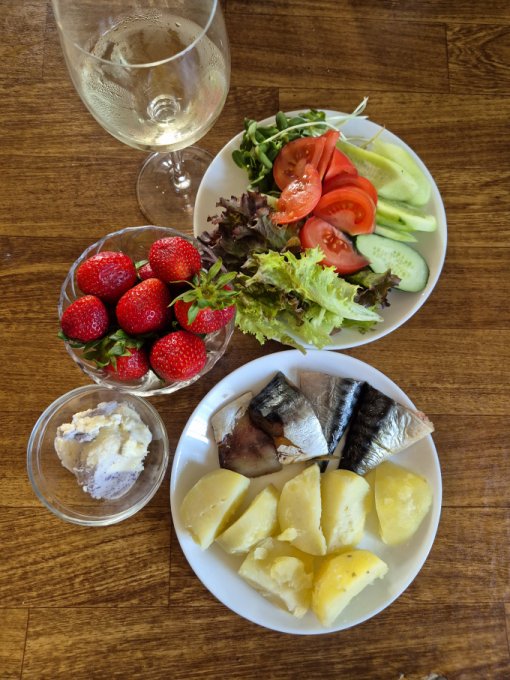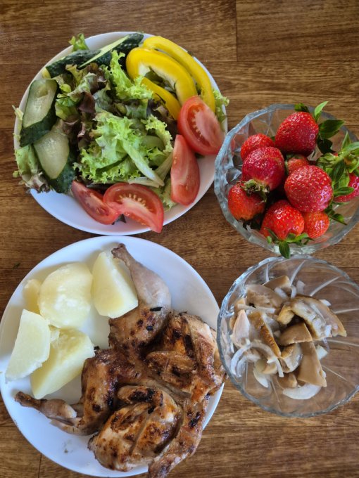 На ужин пожарили на мангале перепёлок, картофель, маринованные грибы, овощи, салат и клубнику ела с мороженым.