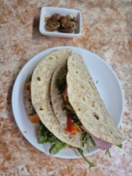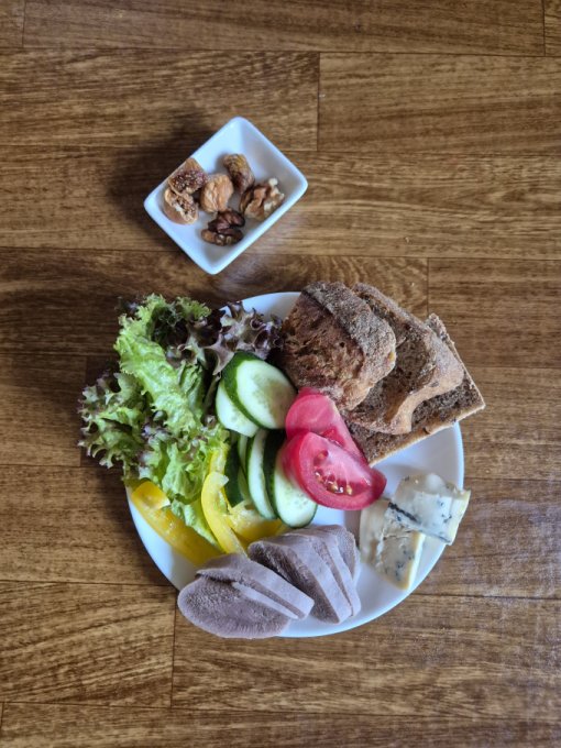 На завтрак ела бутерброды с языком, сыром и овощами. Инжир с грецким орехом.