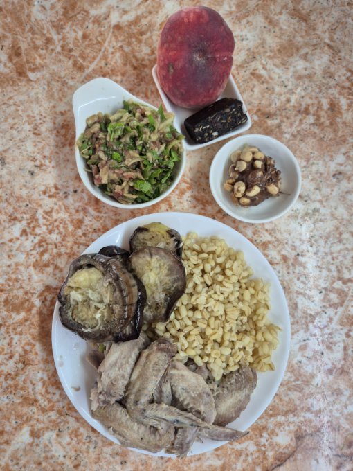Обедала куриными крылышками (за кадром ещё кусочек ножки) с булгуром. Баклажаны, гуакомоле. Десерт огромный: персик, арахис с шоколадной пастой, половинка батончика из овсянки с сухофруктами. Переела по ощущениям.