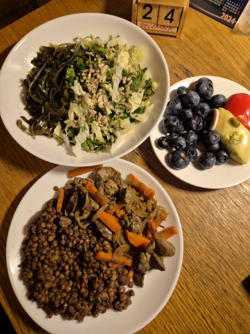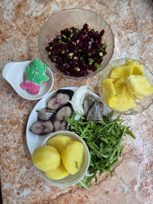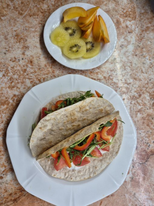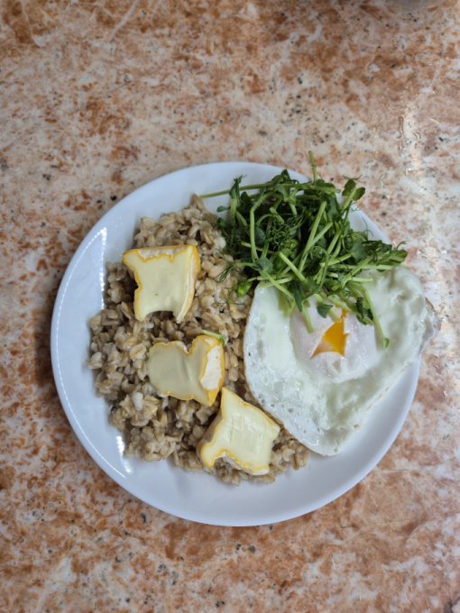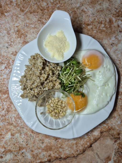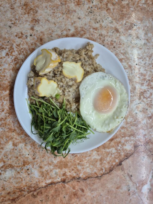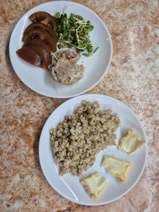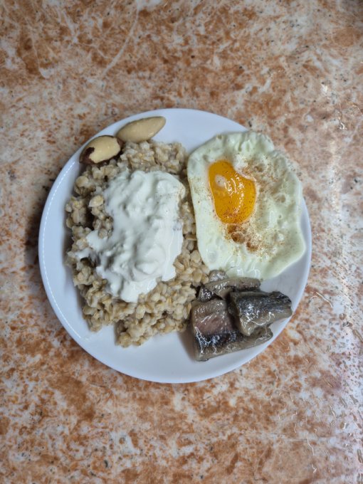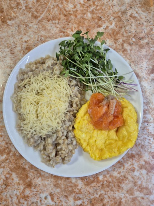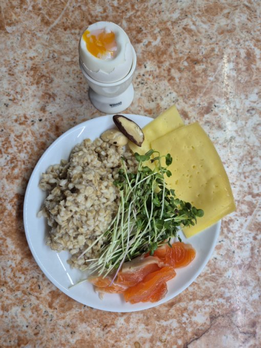 С завтрака убрала яйца (в новогоднюю ночь их будет слишком много в салатах). Ела консервированную рыбу с помидором, микрозеленью и овсянкой с сыром бри.