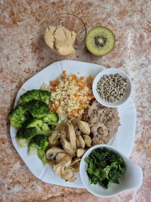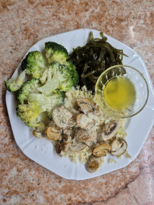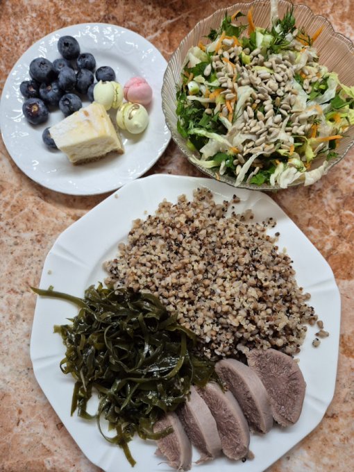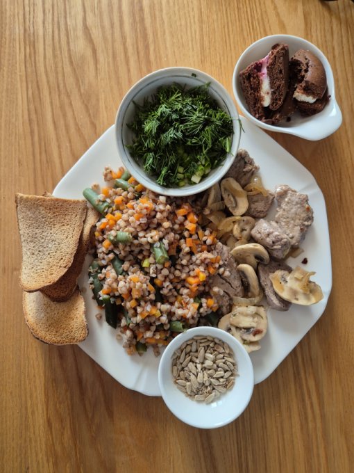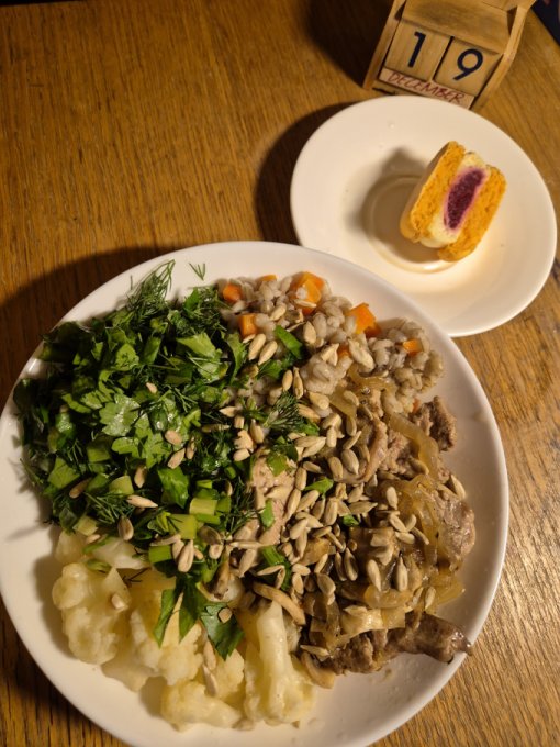 На обед ела свинную вырезку с перловкой, цветную капусту, шампиньоны с луком. Зелень. Порция получилась просто огромной.