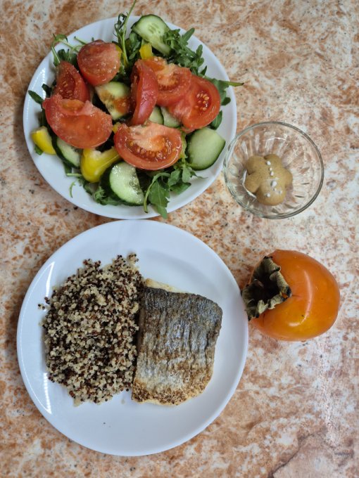 На ужин ела припущенный сибас с киноа и салатом из рукколы, огурца и помидора.