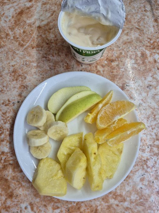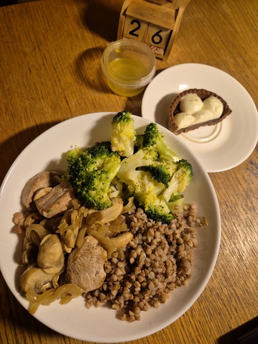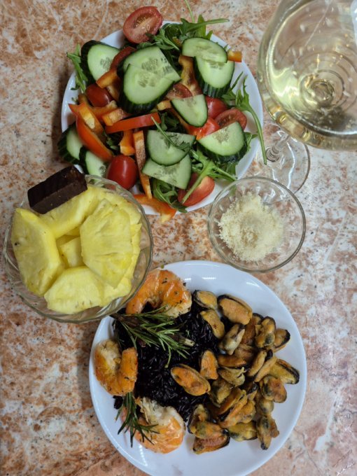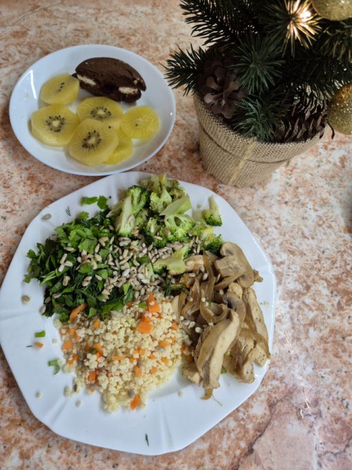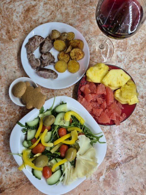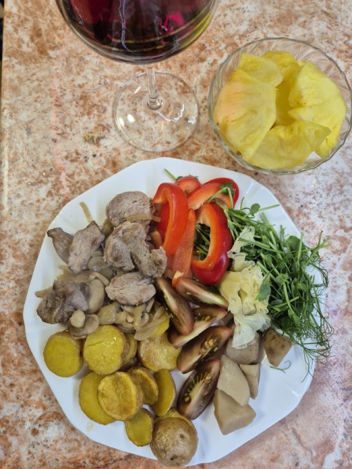 На ужин ела свиную вырезку с луком и шампиньонами, картофель по селянски (огромное количество калия в нём), овощи, микрозелень гороха, маринованные грибы. Ананас и бокал вина 170 мл.
