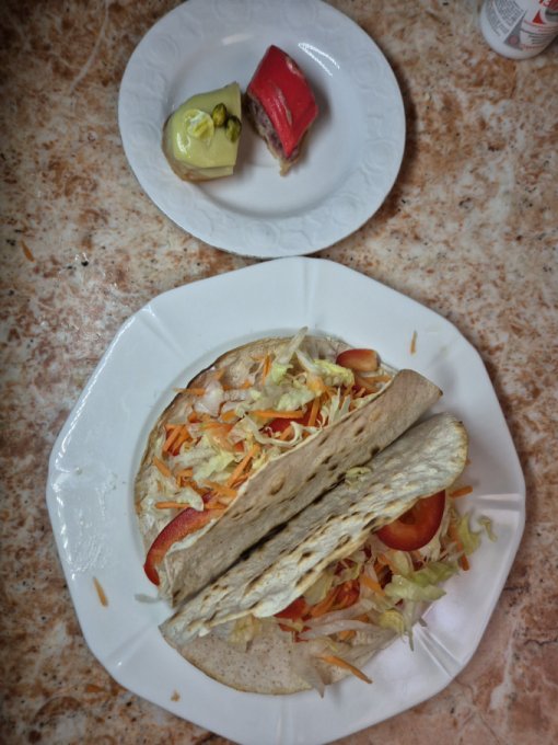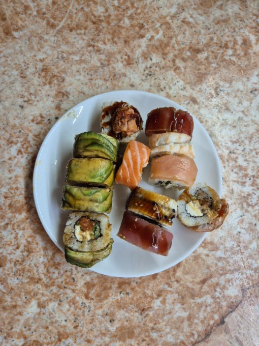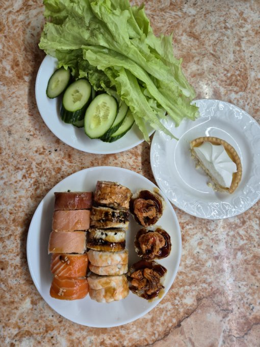 На обед доедала роллы. Немного убрала из них риса и сыра, так что на 100г меньше чем на фото. К роллам калий в виде салата и огурчика , ну и как же без пироженки. ☺️
