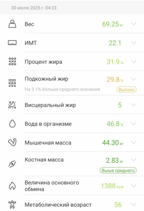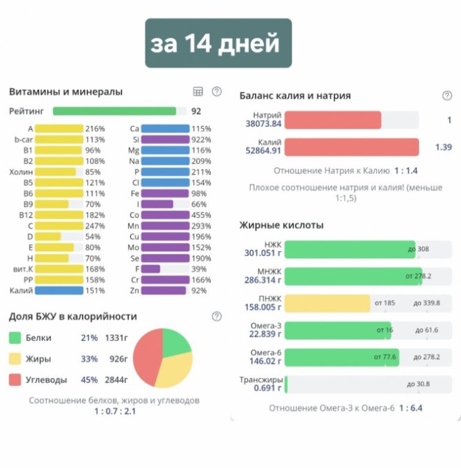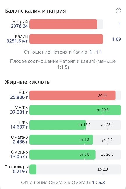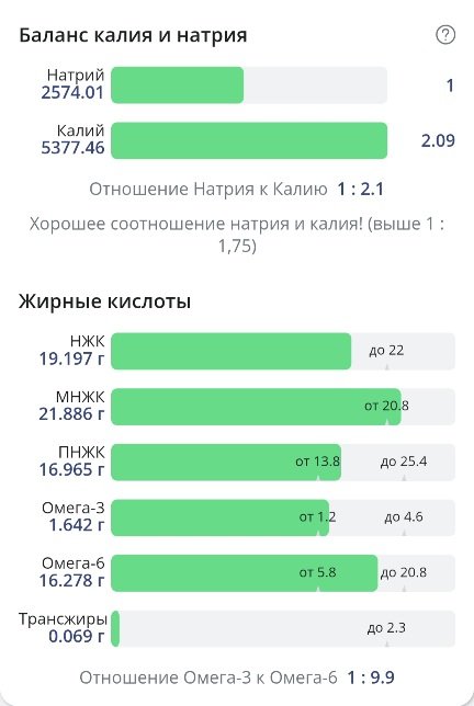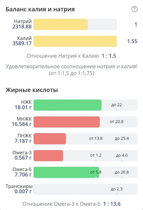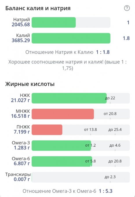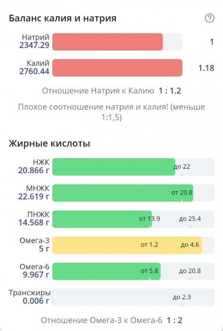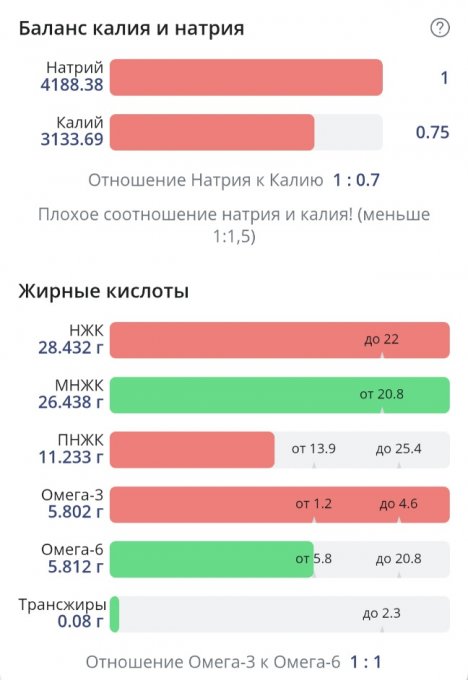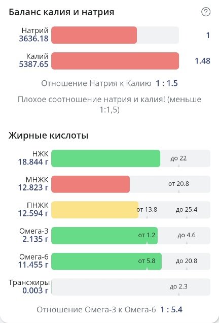 Соль в избытке, небольшой перебор по насыщенным жирам. Белки добрала. Нутритивность неплохая. Большое количество жидкости и соли принесли мне 300г привеса, 69,25 кг.