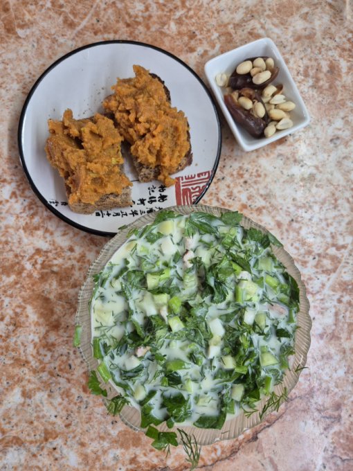 В три часа дня окрошка, бутерброд с кабачковой икрой. Арахис с финиками.