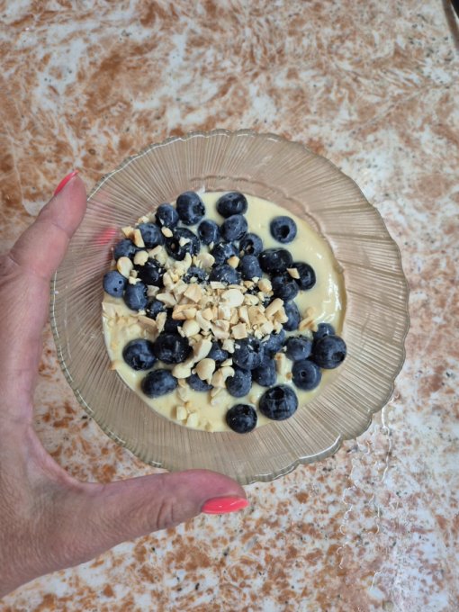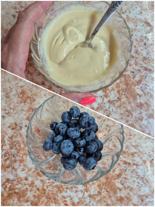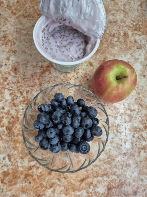 Позже йогурт с чиа, яблоко, голубика. Посчитала БЖУ и добрала белок рыбной консервой.😆 Совсем без белка плохо, будет голодно.