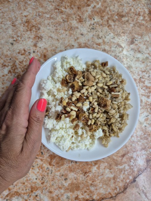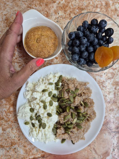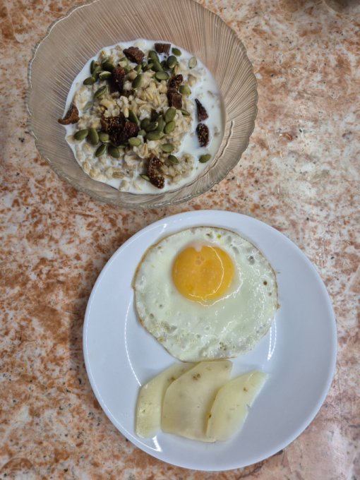 Утром правильный завтрак: овсянка с молоком, инжиром, тыквенными семечками, яйцо, сыр.