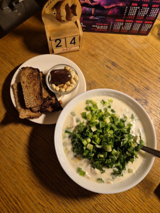 Обедала окрошкой на айране, сухарики, арахис и финики на десерт.