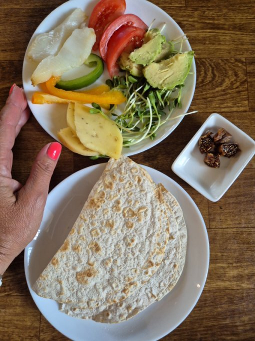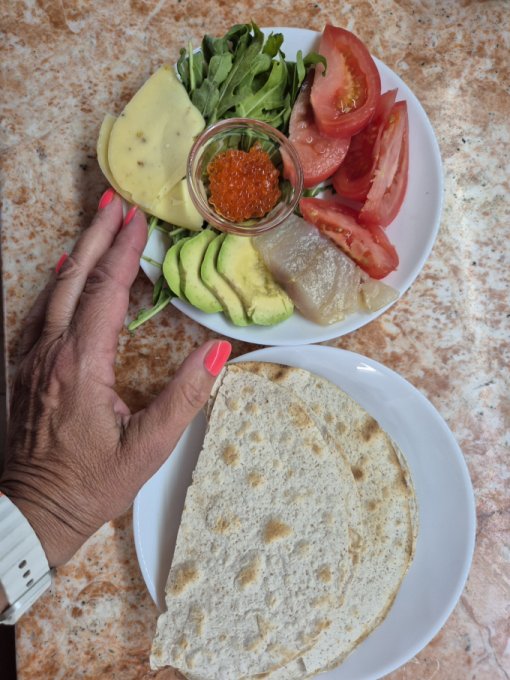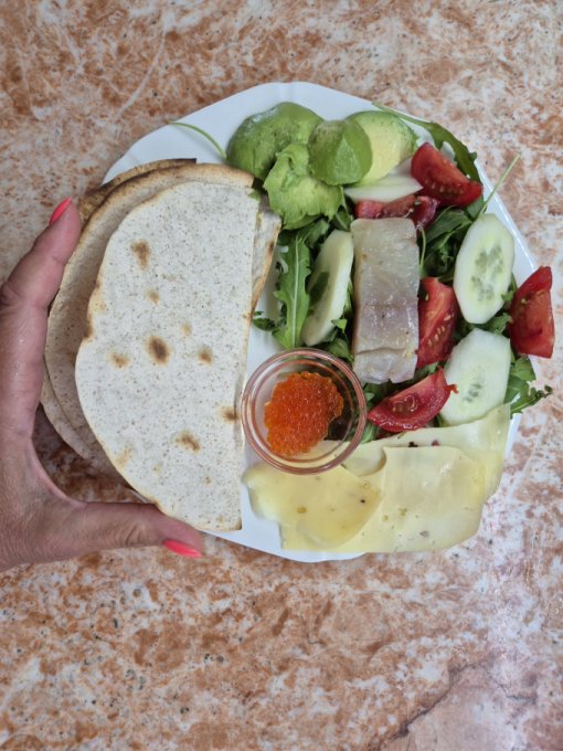 Ужинала с доцей в кафе, съела три тако 🌮 с лососем и авокадо, салат с креветками, выпила комбучу. Дома чуть ежевики.