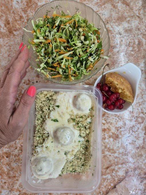Обедала в 15 часов готовой едой из кулинарии: куриные тефтели в сливочном соусе с кус-кусом, в принципе вкусно.