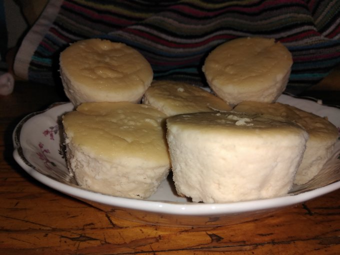 Продолжаю эксперименты. Пыталась сделать блины из козьего молока и кокосовой муки, получилась каша. Кашу съела.)) Остальное тесто налила в формочки и запекла в духовке. Теперь у меня есть порции довольно плотной каши.))) Похоже на кексики или пудинги что ли.