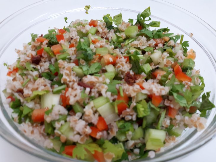 Теплый салат из булгура 150 г, стеблей сельдерея 100 г, болгарский перец 50 г, вяленые помидоры 10 г, кинза 30 г, оливковое масло 2 ч.ложки , соль .
